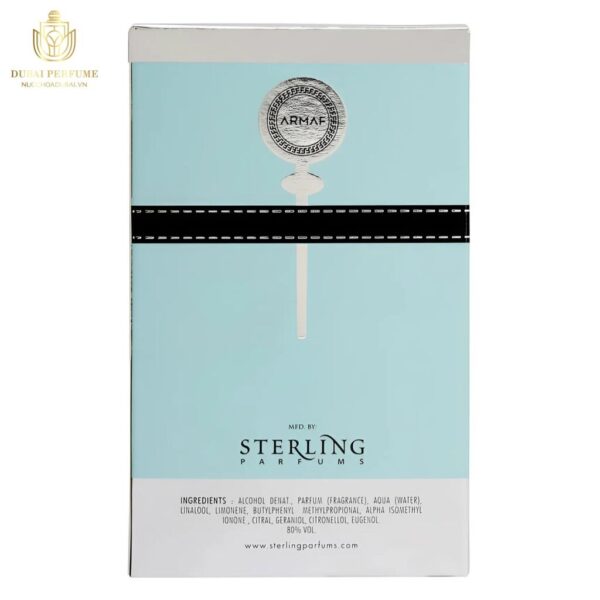 – Tông màu xanh dương chủ đạo bao phủ toàn bộ chai, tượng trưng cho bầu trời bao la, đại dương rộng lớn, khơi gợi cảm giác mạnh mẽ, phóng khoáng và tự do. Nắp chai màu bạc sáng bóng tạo điểm nhấn sang trọng, tinh tế, đồng thời làm nổi bật logo thương hiệu Armaf được dập nổi một cách đầy tinh tế.