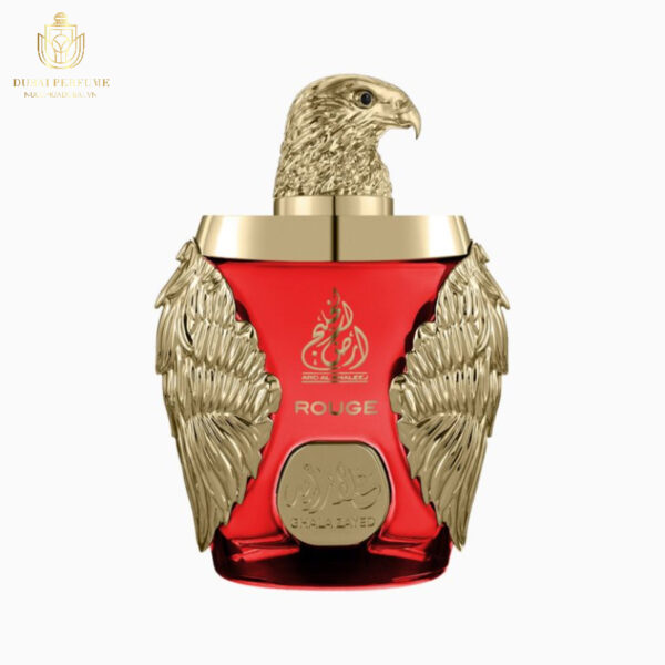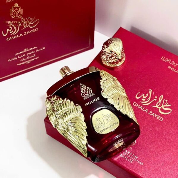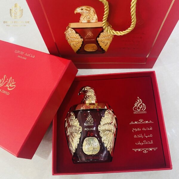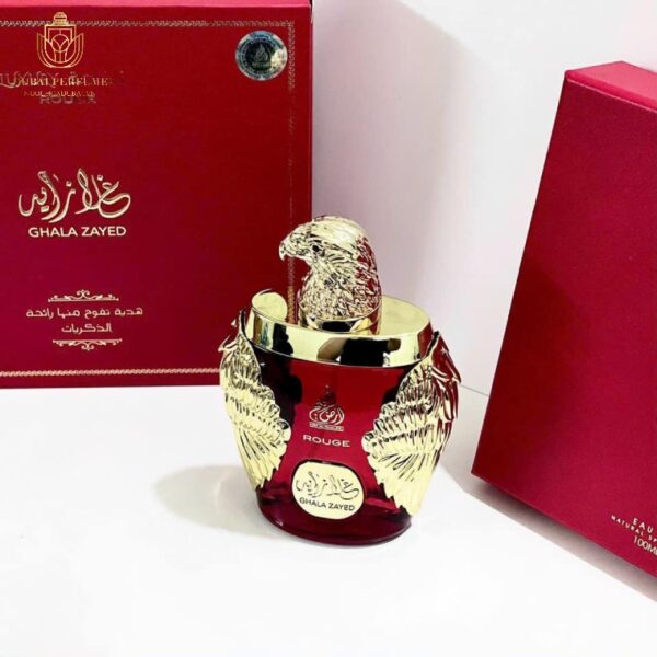 Thiết kế của Ghala Zayed Rouge cũng không kém phần ấn tượng với chai nước hoa màu đỏ, mang hình dáng như con đại bàng, biểu thị sự quyền lực và sang trọng. Chai nước hoa được đặt trong hộp vuông thanh lịch và cổ điển, tạo điểm nhấn tinh tế cho bất kỳ bộ sưu tập nào.