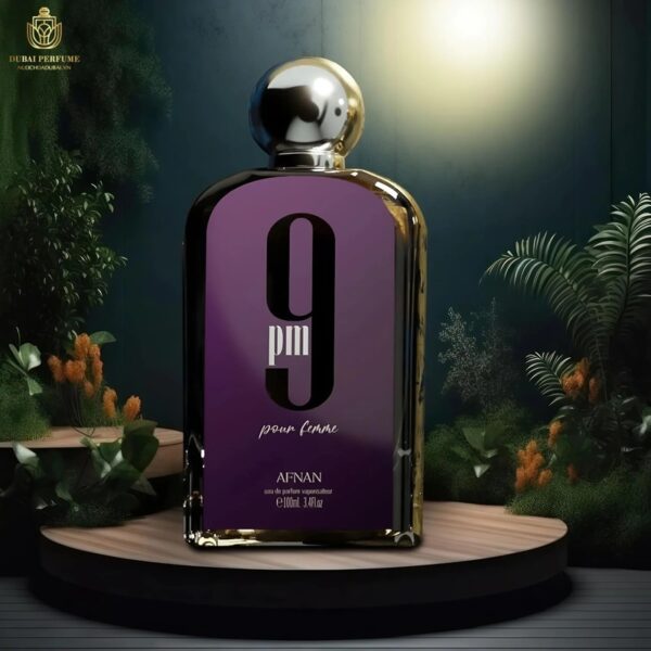 Nước hoa Dubai nữ 9 PM Pour Femme từ Afnan Perfumes sở hữu thiết kế sang trọng và tối giản nhưng vẫn đầy cuốn hút. Chai nước hoa có hình dáng chữ nhật thon gọn, đường nét mềm mại, tạo cảm giác thanh lịch và hiện đại. Phần thân chai được phủ một lớp màu tím đậm đầy bí ẩn, kết hợp với chữ số “9 PM” in nổi bật ở trung tâm, mang lại vẻ ngoài thời thượng và cá tính.