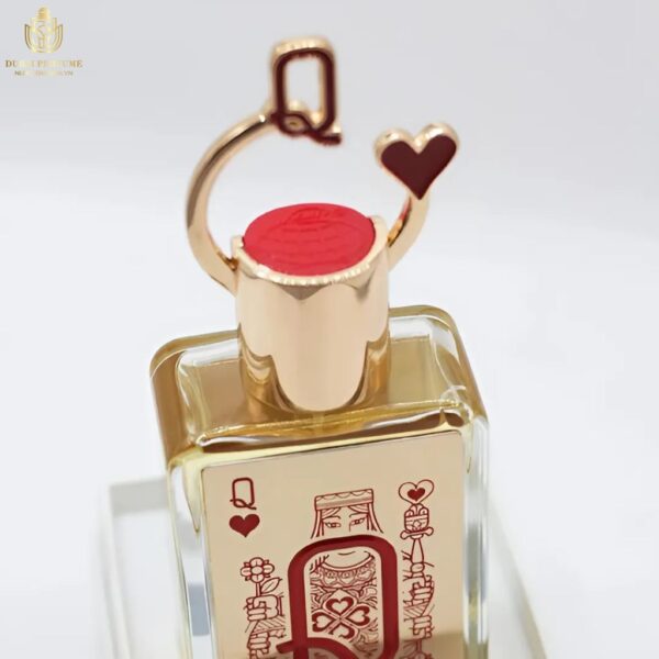 – Thiết kế chai: Chai nước hoa có hình chữ nhật đứng, tạo cảm giác thanh lịch và cao cấp. Mặt trước của chai được in hình một lá bài nữ hoàng đỏ lớn với chữ Q cách điệu, nổi bật trên nền trắng. Phần thân chai được làm bằng thủy tinh trong suốt, giúp tôn lên màu sắc của nước hoa bên trong.