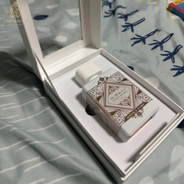 – Chai nước hoa thường có hình chữ nhật với các góc cạnh được bo tròn nhẹ nhàng. Sự kết hợp hài hòa giữa màu trắng và vàng tạo nên một tổng thể sang trọng và tinh tế, gợi liên tưởng đến những cung điện tráng lệ ở Trung Đông.
