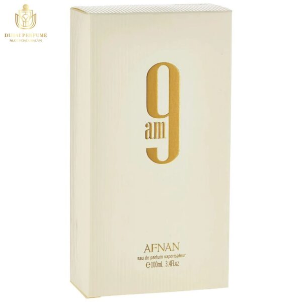 – Trên mặt trước hộp giấy được in tên nước hoa “9 AM EDP” và logo thương hiệu Afnan màu vàng kim nổi bật.