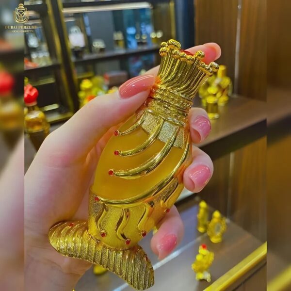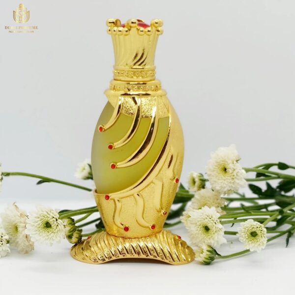 Tinh dầu nước hoa Dubai Ikhlas gây ấn tượng mạnh mẽ với thiết kế sang trọng và tinh xảo. Lọ nước hoa mang sắc vàng chủ đạo, toát lên vẻ đẹp hoàng gia đầy quý phái. Những đường cong mềm mại uốn lượn trên thân chai tạo cảm giác thanh lịch, kết hợp với các họa tiết điểm xuyết bằng những viên đá đỏ nhỏ lấp lánh, càng làm tăng thêm nét tinh tế và đẳng cấp. Phần nắp chai được thiết kế cầu kỳ với hình dáng vương miện, thể hiện sự quyền lực và sang trọng. Hộp đựng cũng được chăm chút tỉ mỉ với tông vàng ánh kim lộng lẫy, điểm xuyết những hoa văn sắc sảo, khẳng định đẳng cấp của dòng nước hoa tinh dầu Dubai cao cấp.