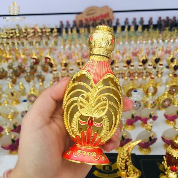 Chai tinh dầu Khalsat là một tác phẩm nghệ thuật thu nhỏ, toát lên vẻ đẹp sang trọng và tinh tế của văn hóa Dubai. Thiết kế chai lấy cảm hứng từ những cung điện tráng lệ, với đường nét hoa văn tinh xảo được chạm khắc tỉ mỉ trên nền vàng óng ánh. Nắp chai được đính đá quý, tạo điểm nhấn quý phái và thu hút mọi ánh nhìn. Màu đỏ chủ đạo của chai tinh dầu tượng trưng cho sự may mắn và thịnh vượng, mang đến cảm giác ấm áp và gần gũi. Hình dáng chai uốn lượn mềm mại, gợi liên tưởng đến những chiếc bình cổ xưa, thể hiện sự kết hợp hài hòa giữa nét đẹp truyền thống và hiện đại.
