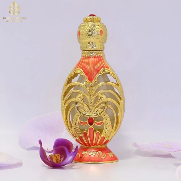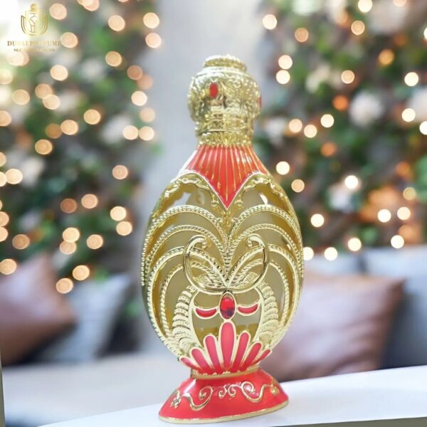 – Thiết kế sang trọng và tinh tế: Chai tinh dầu có thiết kế lấy cảm hứng từ những cung điện tráng lệ, với những hoa văn tinh xảo và màu đỏ chủ đạo, tạo nên một sản phẩm vừa đẹp mắt, vừa quý phái.