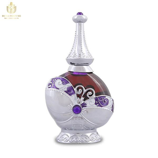 Hình ảnh tinh dầu nước hoa Dubai Al Aqmar đã thực sự gây ấn tượng mạnh với thiết kế độc đáo và sang trọng. Chai nước hoa được bao bọc bởi lớp vỏ bạc óng ánh, tạo nên vẻ đẹp quý phái và hiện đại. Nổi bật trên nền bạc là những họa tiết hoa văn tinh xảo, mang đậm phong cách Trung Đông, gợi lên sự huyền bí và cuốn hút. Nút chai màu tím đậm cùng với những viên đá nhỏ lấp lánh càng làm tăng thêm vẻ đẹp lộng lẫy cho sản phẩm.