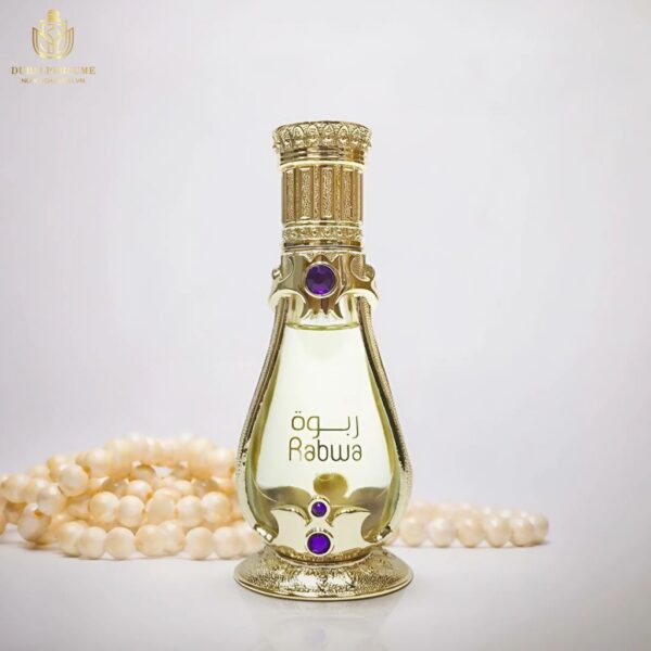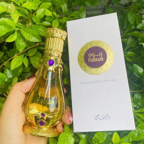 Tinh dầu nước hoa Dubai Rabwa từ thương hiệu Rasasi mang đến hương thơm quyến rũ, ngọt ngào và sang trọng. Với hương vani ngọt ngào, xạ hương ấm áp và hoa hồng sâu lắng, Rabwa là sự lựa chọn hoàn hảo cho những buổi tiệc hay hẹn hò. Thiết kế tinh xảo, kết hợp giữa màu vàng kim và tím quý phái, cùng thời gian lưu hương từ 10 – 12 tiếng, khiến sản phẩm trở thành phụ kiện đẳng cấp cho phái đẹp.