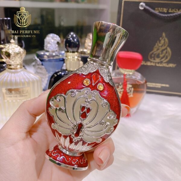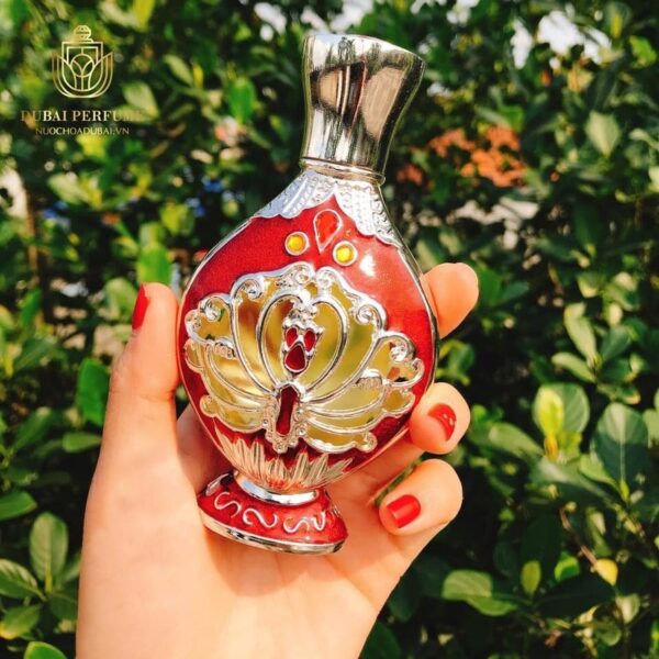 Tinh dầu nước hoa Dubai Nữ Samiya gây ấn tượng với thiết kế thủy tinh cao cấp phủ tông màu đỏ rực rỡ. Được điểm xuyết bởi các họa tiết bạc tinh xảo.